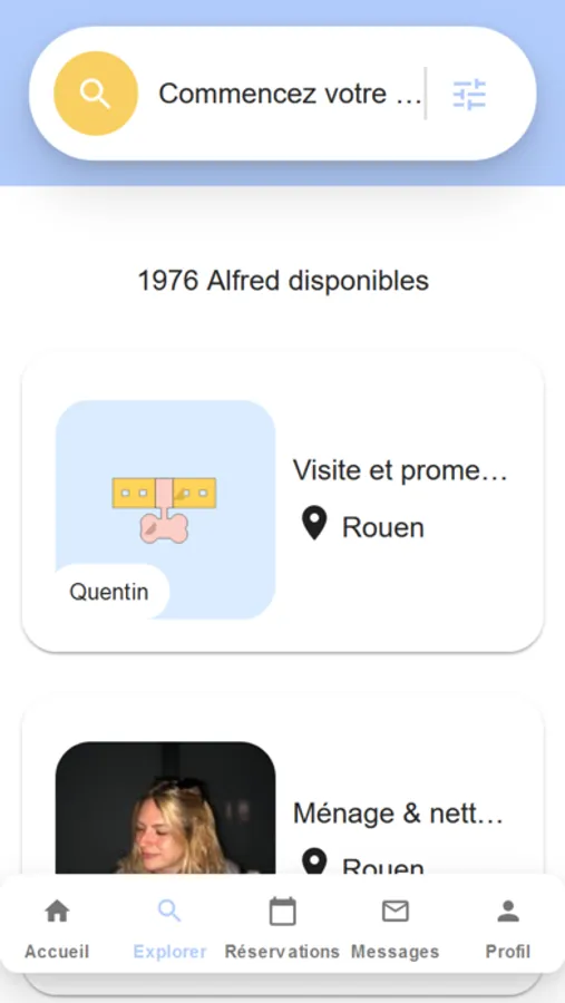 Choisissez parmi des milliers de services disponibles sur toute la France. Vous pouvez réserver un service de bricolage, de jardinage, une garde de chien, un babysitting, un cours particulier… Vous pouvez prendre soin de vous avec des services de beauté, du coaching, des cours de yoga, des cours de cuisine. Effectuez votre recherche de service et sélectionnez votre Alfred qui correspond à vos critères (prix, notations, commentaires, affinités) et réservez son service directement en ligne. C’est immédiat !