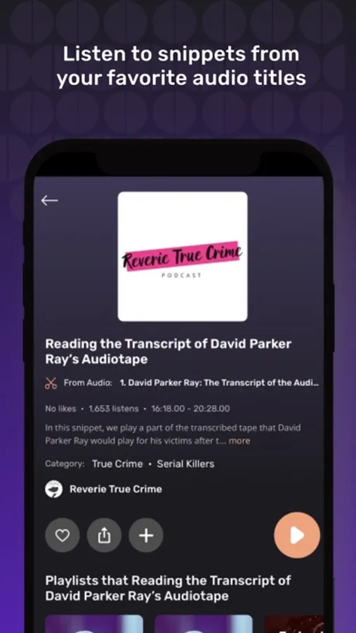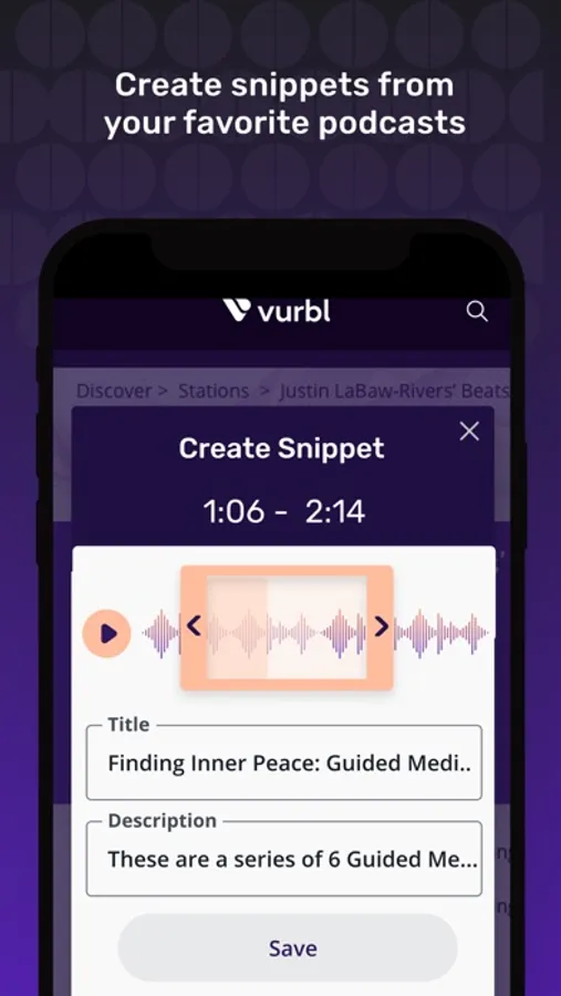 Clip what you love from any audio to share. You can create snippets of your favorite bits from podcasts, stories, concerts or random audio files on Vurbl!