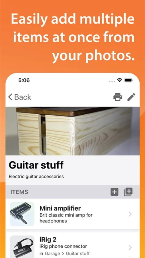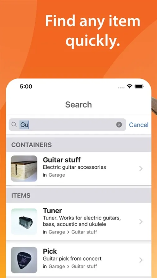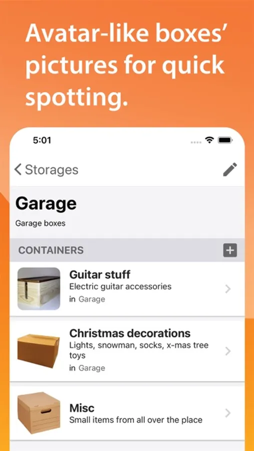 Each item and container have pictures to simplify visual recognition, name, and description - to easily search for specific items.