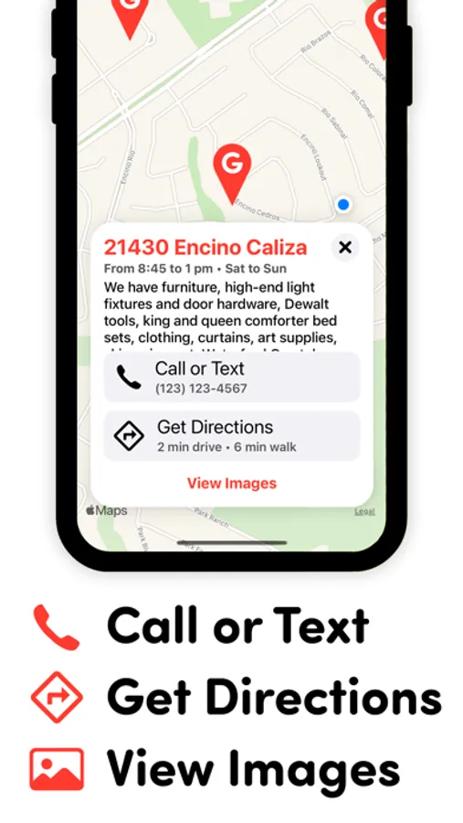 View a map of nearby garage sales and locate the ones you want to go to. For each garage sale you can: