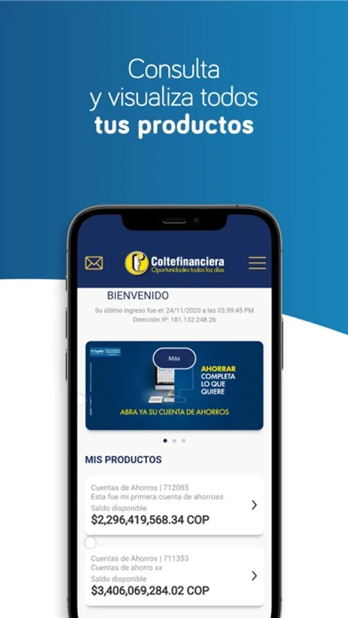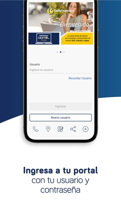 Con esta aplicación podrás actualizar tus datos personales, consultar toda la información relacionada a tus productos y movimientos, realizar y programar transferencias de forma segura a cuentas propias, a terceros y a otros bancos, pagar tus créditos y conocer nuestros puntos de atención.