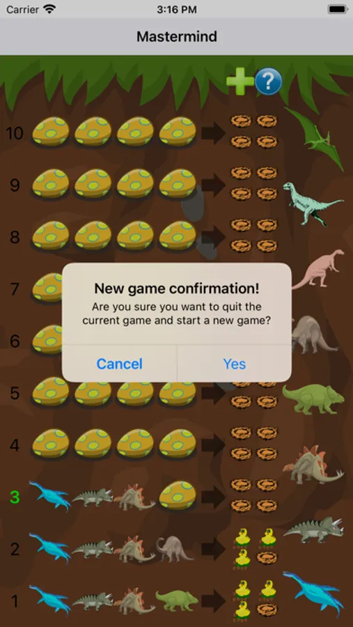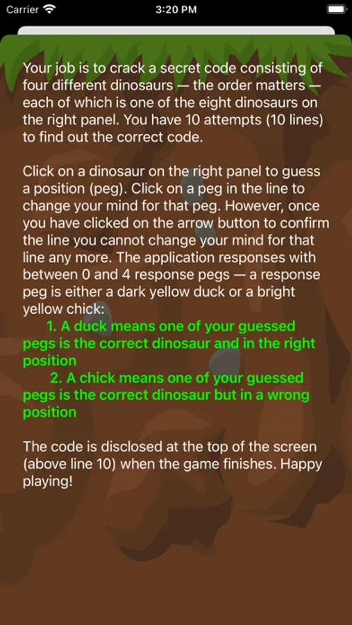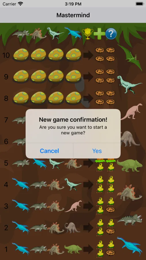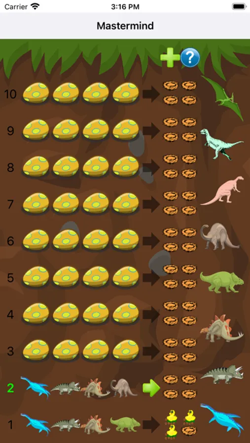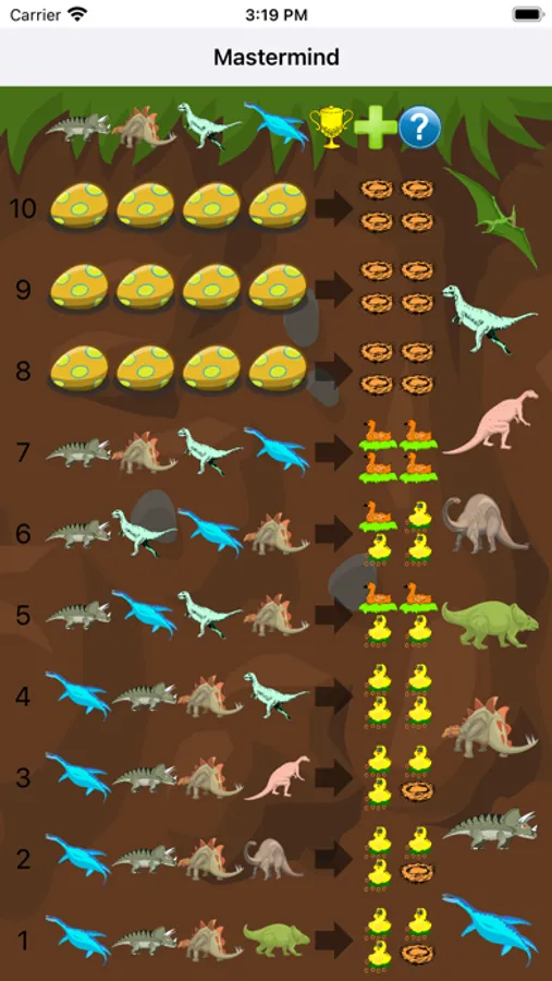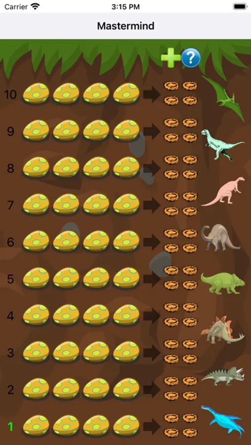 This mastermind game goes beyond traditional boards and pegs by using dinosaurs and dinosaur eggs. The player is allowed 10 attempts to find out the secret code consisting of four different dinosaurs.