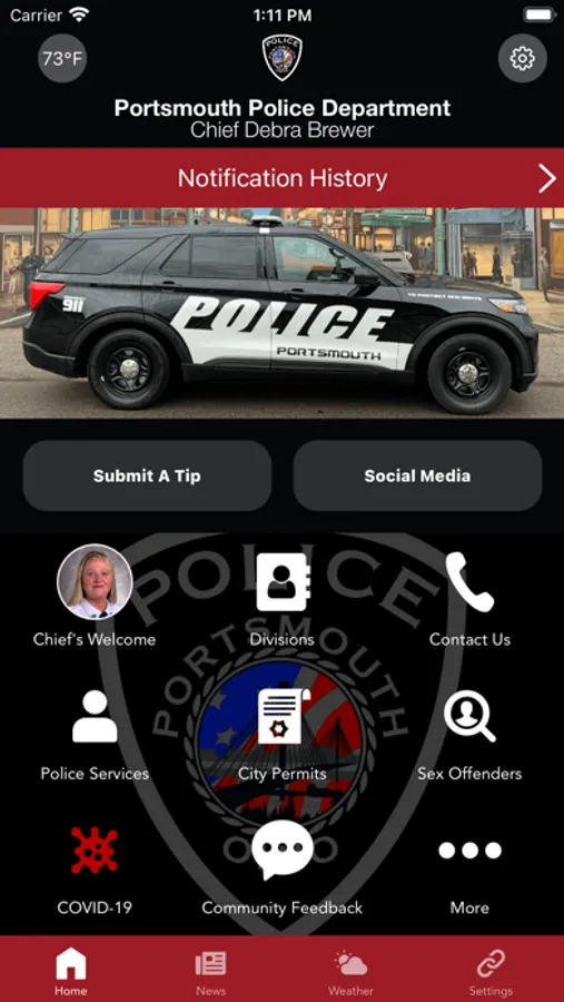 The Portsmouth, Ohio Police Department mobile application is an interactive app which will help improve our communication with the citizens of Portsmouth and surrounding area. The purpose of this app is to improve our ability to communicate with our citizens Information which will include, but not be limited to submit a tip, sex offenders, officer contact information, fingerprint information city permits, police services, and more. Citizens may submit a crime tip directly through the app, as well as see and share social media posts. By empowering people through technology, the Portsmouth Police Department will be able to better protect our county.