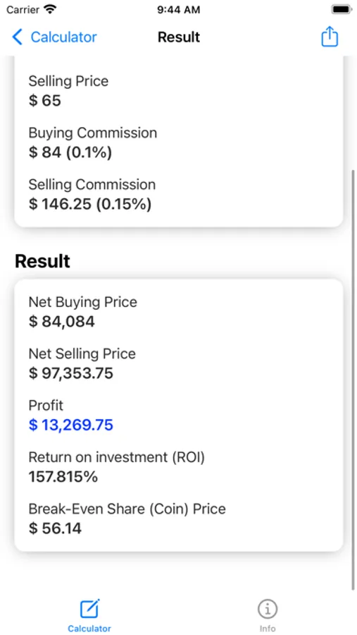 Use this App to calculate returns on stocks. We also provide you with other results such as: Break-Even Share Price, ROI, Net Selling Price, Net Buying Price. This is a very intuitive App, simple and easy to use.