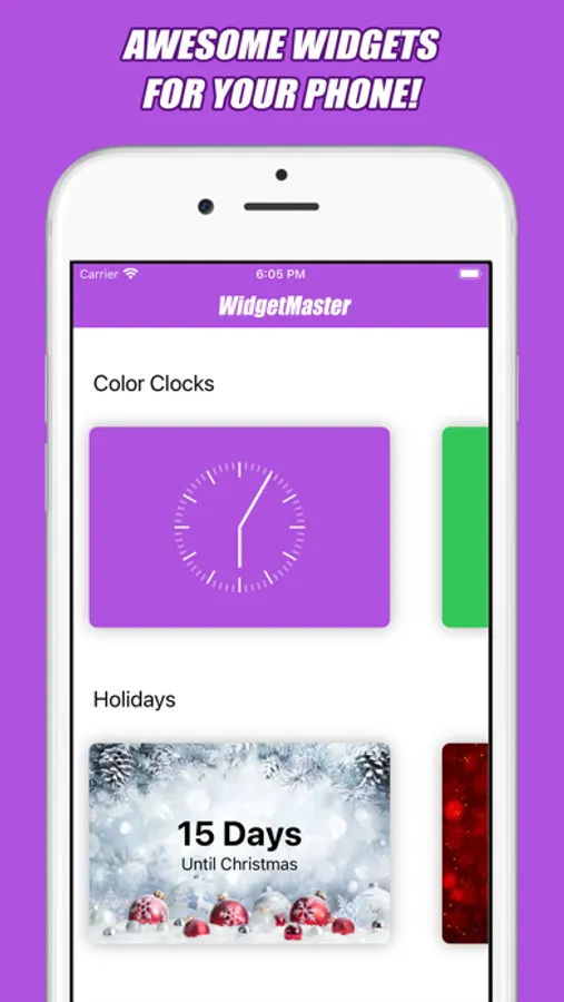 WidgetMaster gives you an awesome assortment of high quality color widgets you can use to customize your phone. Color Clocks, Famous Quotes, Holiday Countdowns and More!