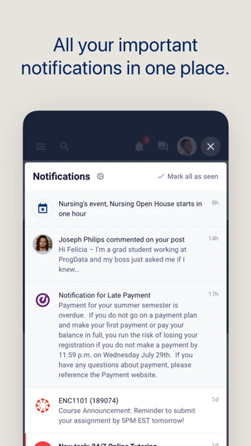 Receive updates when grades are published, assessments are due and announcements are posted.