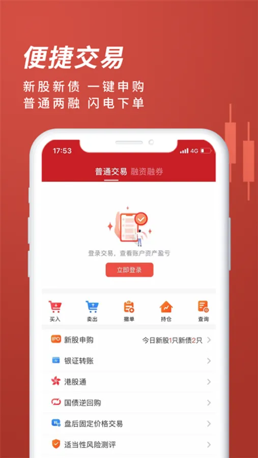 ④闪电下单:指尖下单,买卖随心,股票、基金、债券等高速交易通道,普通、两融委托灵活