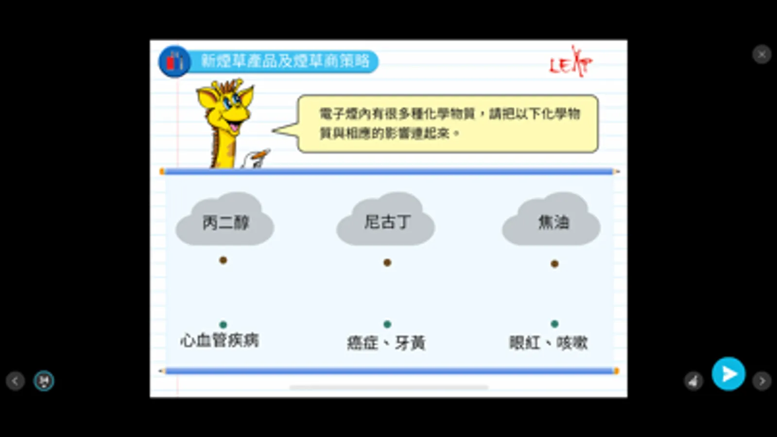 1. 多元互動學習活動:有別於一般網上短片及簡報,LEAP電子書結合有趣的練習和互動電腦遊戲、影像及經驗分享三種學習元素,提升趣味,激發學生學習動機。
