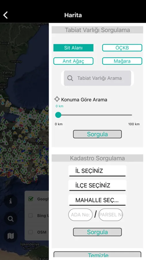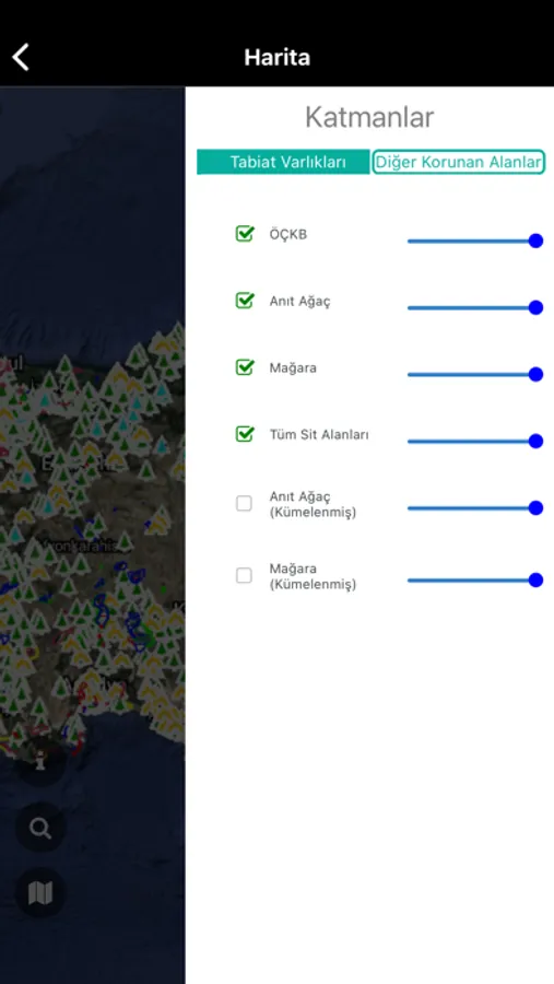 • Tabiat Varlıkları ve Korunan Alanların farklı altlık haritalarla birlikte öğrenerek sorgama yapılabilen harita bileşeni mevcuttur.