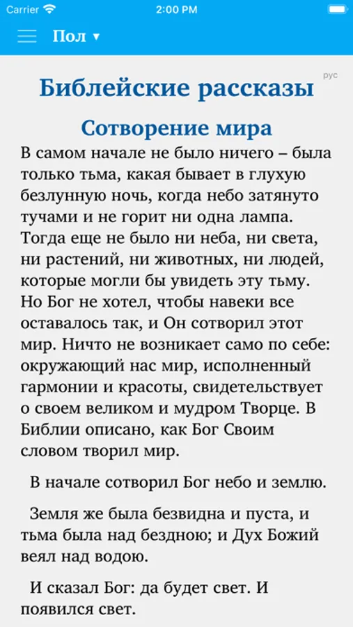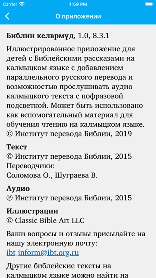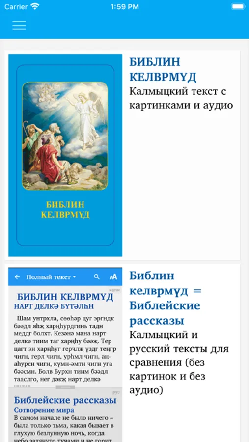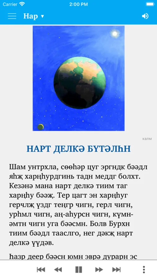 An app for children with Bible stories in Kalmyk with the addition of a parallel Russian translation and the ability to listen to audio of the Kalmyk text with phrase-by-phrase highlighting. Can be used as an auxiliary material for learning to read in Kalmyk.