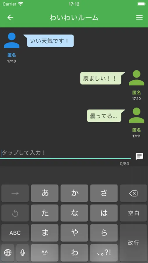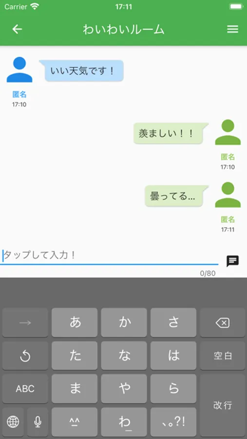 表示されているルームをタップして、発言を行うとルームに参加状態となります。発言するまでは参加人数としてカウントされません。他のユーザーが先に発言してルームが満員になった場合、そのルームには参加できませんのでご注意ください。