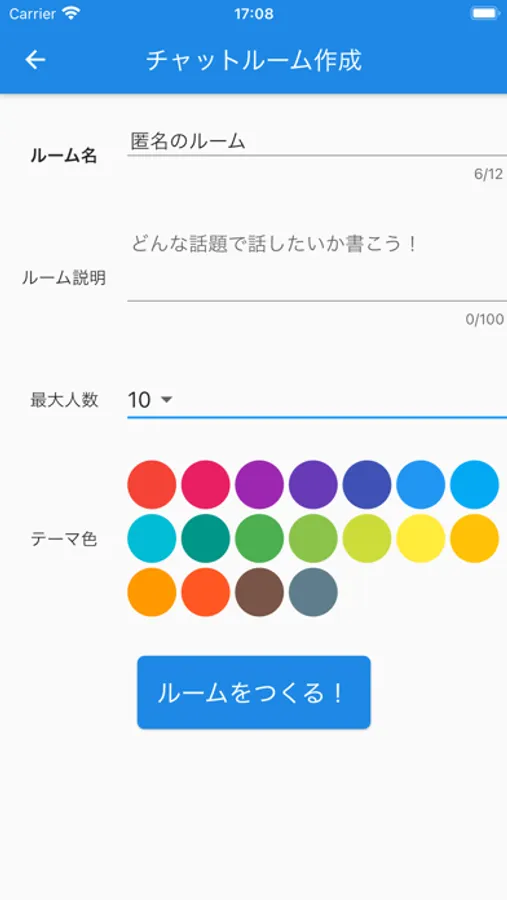 ルームの名前、どのような話題で話すかの説明、テーマ色、参加可能人数を設定して「ルームをつくる」をタップします。ルームが作成されると自動的にルーム画面に移動します。