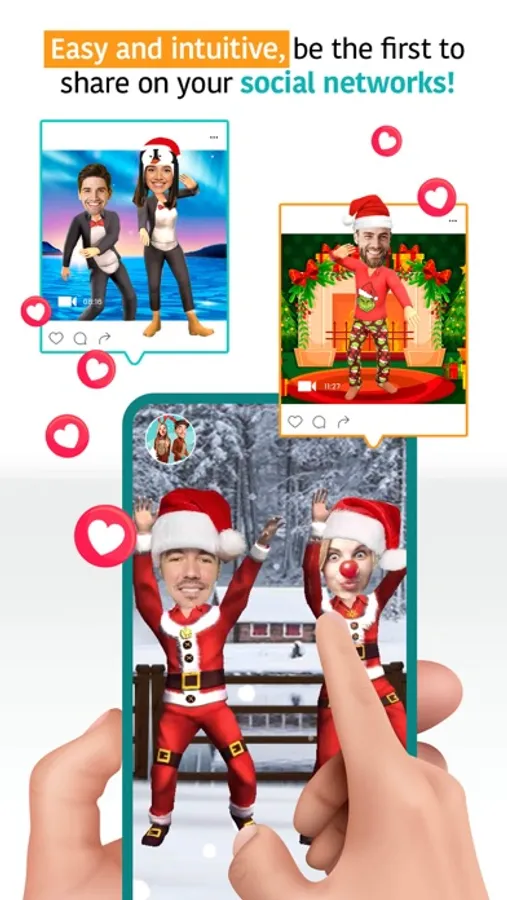 Perform dances individually or with more people or pets, and we promise that the more people you add, the funnier your video will be. All you need is photos of your friends and family and you are ready for some great laughs with your loved ones. Just add photos of your friends and family and watch them dance to Christmas music with you. We offer you many different options to show your moves. Choose the theme that you like and put your face in 3D in these hilarious animations. Create your video and share it with on your social media. Make video calls with your friends, show them your animated dancing videos and celebrate it together with joy! Come on over and just dance with us!