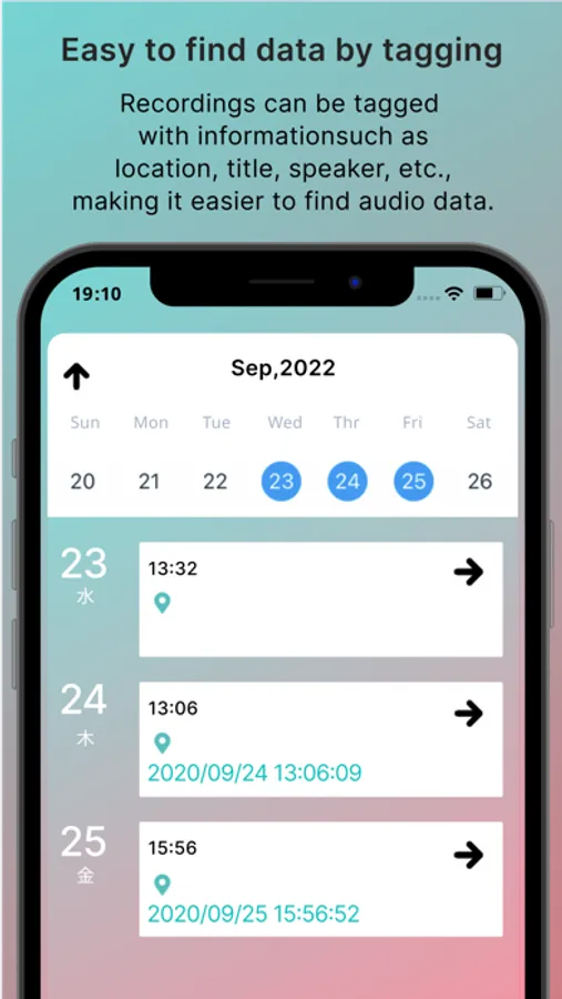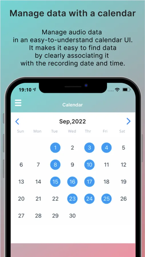 Manage audio data in an easy-to-understand calendar UI. It makes it easy to find data by clearly associating it with the recording date and time.