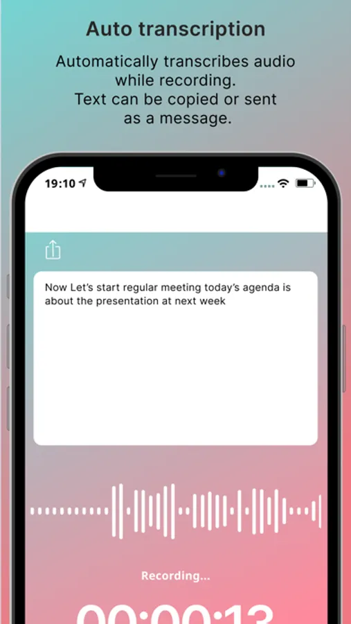 Automatically transcribes audio while recording. Text can be copied or sent as a message.