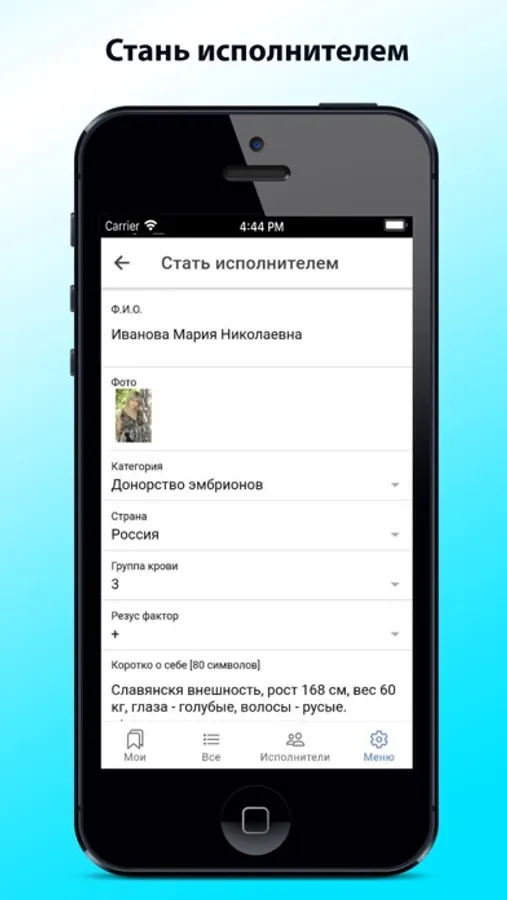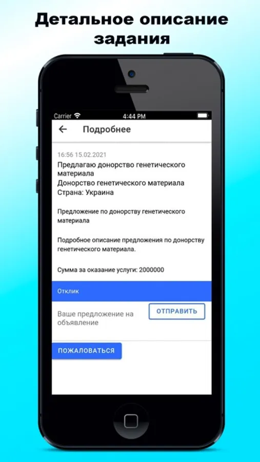 Настоящее приложение призвано объединить людей с целью помощи в человеческом воспроизводстве. Это узконаправленная платформа, позволяющая людям найти друг друга и с помощью вспомогательных репродуктивных технологий (ВРТ) устранить бесплодие. На платформе можно предложить услуги по донорству ооцитов (яйцеклеток), семенной жидкости, а также услуг суррогатного материнства. Одновременно платформой могут воспользоваться соискатели данных услуг. Субъекты, предлагающие свои услуги, должны соответствовать установленным законодательством медицинским критериям. Приложение лишь позволяет людям найти друг друга, а не подменят медицинские учреждения, осуществляющие медицинские манипуляции.. Приложение помогает осуществить первый этап проведение программы ВРТ- отбор пациентов. Стороны сами в приложении выставляют стоимость услуг, другая сторона может отклонить или принять стоимость, а также предложить свою стоимость. Приложение берет 7% комиссии от согласованной суммы сделки между сторонами. Стороны несут ответственность в соответствии с действующим законодательством страны – места заключения сделки.