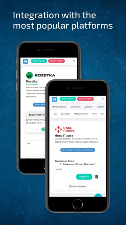 - receive orders from Prom.ua, Rozetka, Хорошоп, OpenCart, WooCommerce and control stock levels on all your platforms without leaving our system.