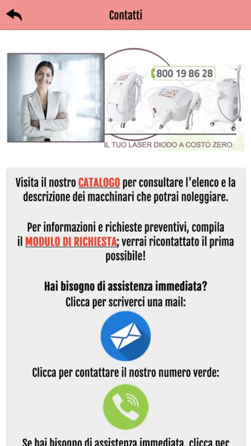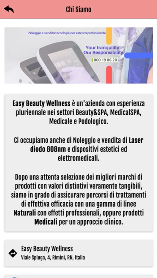 App creata per il Centro Estetico, SPA, Centro Medico Estetico non invasivo, per dare l'opportunità di avere sempre a portata di mano un catalogo di apparecchiature ad alto contenuto tecnologico nel settore estetico-medicale, poter richiedere soluzioni su misura, avere la possibilità di un supporto veloce e completo per ogni esigenza.