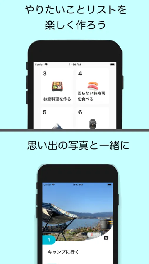 大切な目標を忘れないようしっかり管理し、達成したらそのときの思い出の一枚の写真と共に大切に記録します。目標の一覧が写真で一杯になったら、目標を達成したぞという達成感と共に大切な思い出が詰まったアプリになっていることを願っています。
