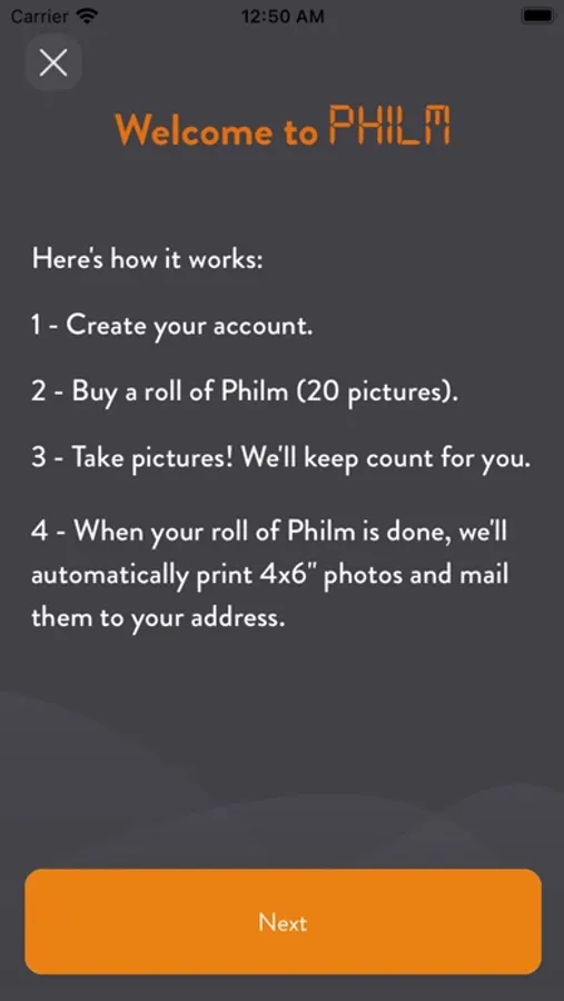 Philm turns your phone into a disposable camera - take photos and when the roll is complete we'll automatically print them and mail them to you.