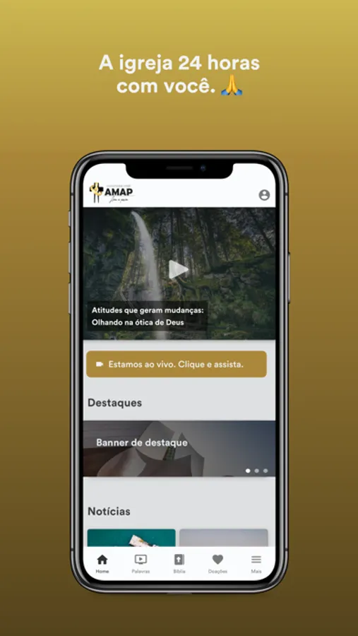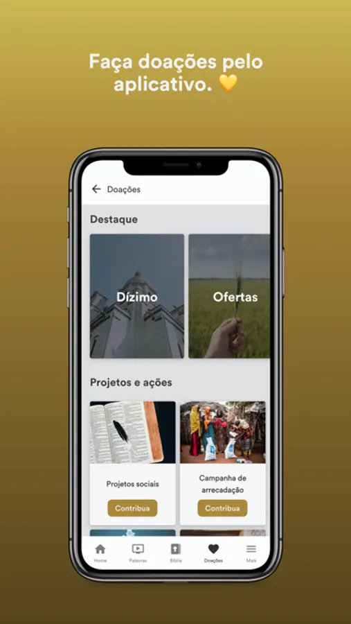 - Doe ou contribua com a igreja diretamente pelo aplicativo através de cartão de crédito ou boleto.