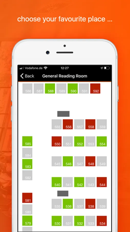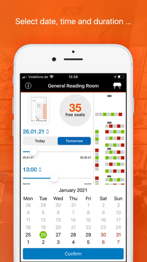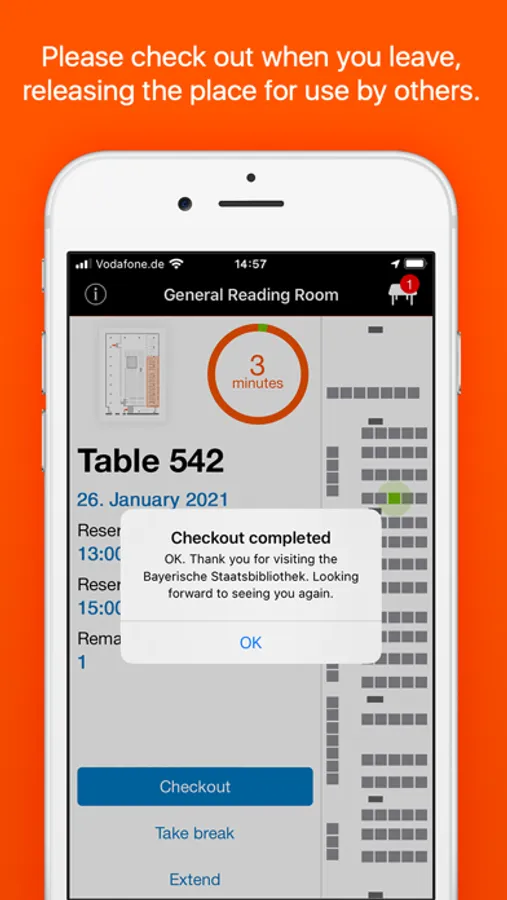 Select the date and time, the duration of the reservation and the desired desk. Up to five dates can be reserved in advance. When you enter the General Reading Room at the start of the reservation period in question, you will find a display with your personal check-in code at the reserved reading desk. In this way, you can check in on site, keep your work place blocked out for other users by using a break function, and you can check out again at any desired time.