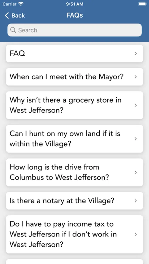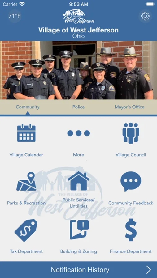 The Village of West Jefferson Ohio mobile application is an interactive app developed to help improve communication and to provide mobile access to many Village services. The Village of West Jefferson Ohio App allows residents to connect with the various Village departments, including the Police department, and Utility Department, as well as providing the community the latest public news and information, including Council meetings, Village events and important updates.