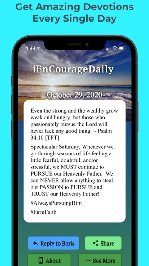 The iEncourageDaily app will allow you to share the daily devotions with others as well as reply back to Boris with a testimony and/or prayer request. Regardless of your time zone, you can even personalize the time you would like to receive the devotion during the day, up to 3 times a day, morning, noon, and/or night.