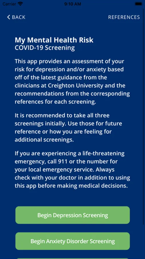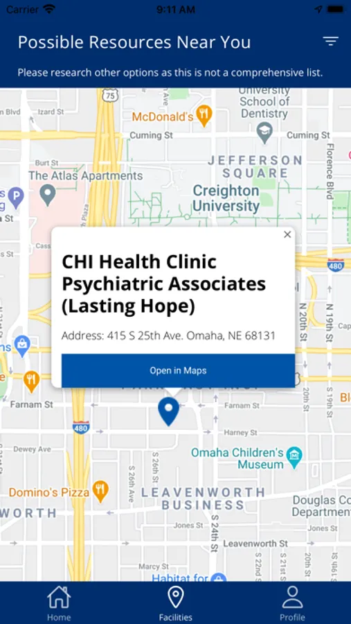 The user can view available local mental health resources on a map and be navigated to them if needed. For emergency situations always call 911.