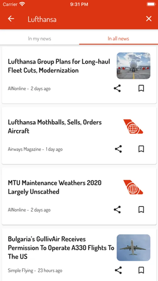 With Aero24, you'll see the aviation news from the top sources of your choice. Additionally, you'll be able to search the whole content, save articles and share them with your friends or colleagues.