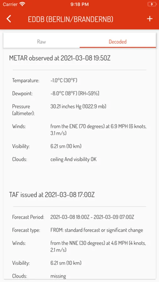 In addition, the weather information (METAR/TAF) is provided in the app in raw and decoded format.