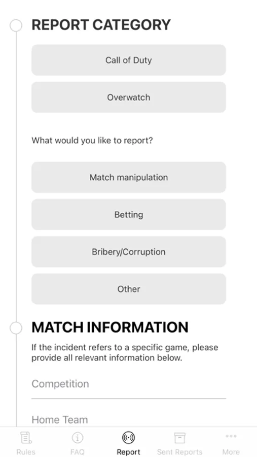 At Activision Blizzard, we are determined to provide players with a safe and fun environment to compete in all leagues and competitions at all levels. Our Integrity Reporting application is designed to do just that, providing you with a platform to report - safely and securely - any potential approaches that put the integrity of competition at risk. From match manipulation to bribery and corruption, the app is designed to equip players with the right technology to provide important information directly to the responsible stakeholders who protect fair play across all of our competitive leagues.
