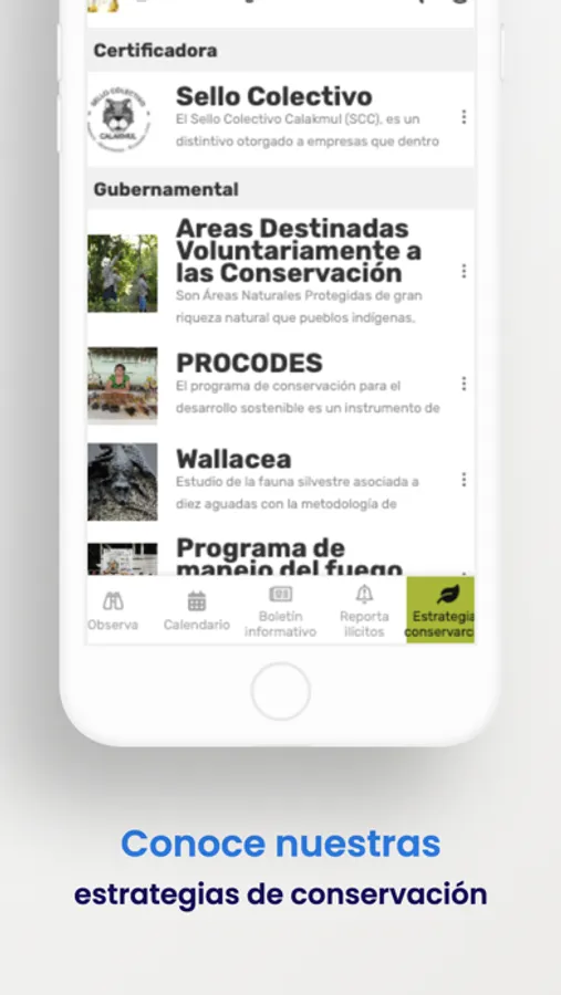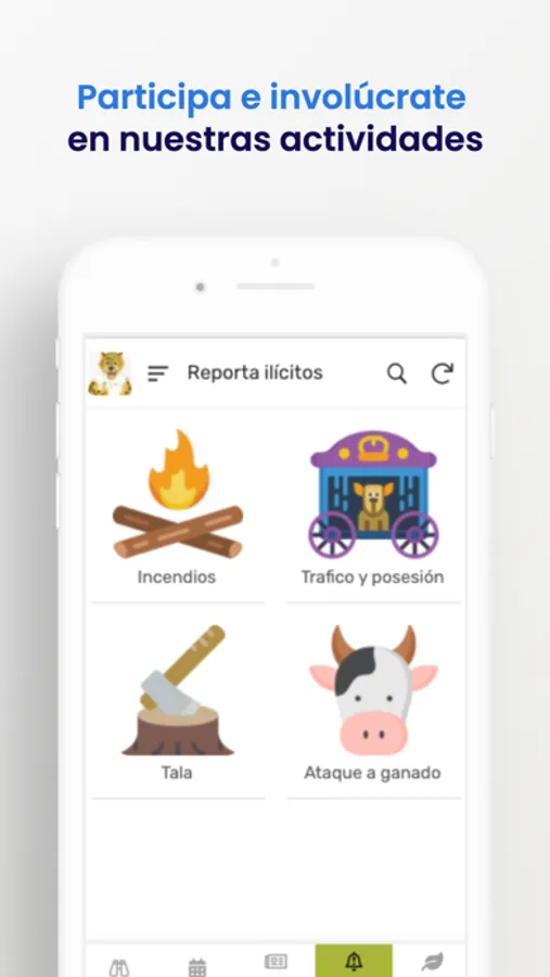 - La sección de reportes de ilícitos donde podrás dar aviso a las autoridades en caso de: Incendio forestal, Tala ilegal, Tráfico y posesión de especies de vida silvestre y ataques a ganado por depredadores naturales.