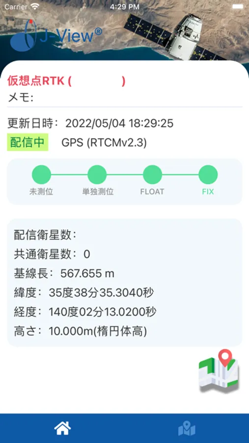 観測状況(未測位、単独測位、Float、Fix)、配信衛星数、緯度・経度・高さ等を確認できます。
