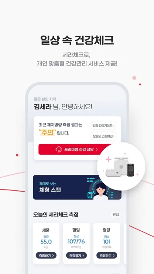 세라체크 측정 결과를 기반으로 앱을 통해 월간 건강 리포트 및 콘텐츠 등 개인 맞춤형 건강 관리 가이드를 제공하고, 다양한 멤버십 혜택을 제공하는 세라젬의 새로운 헬스케어 플랫폼입니다.