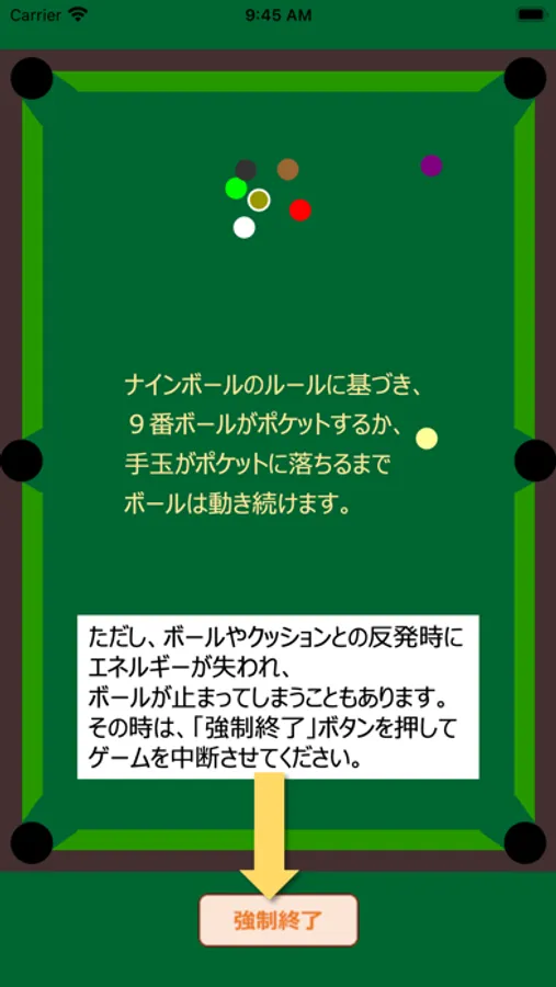 ナインボールのルールに基づき、9番ボールがポケットするか、手玉がポケットに落ちるまでボールは動き続けます。