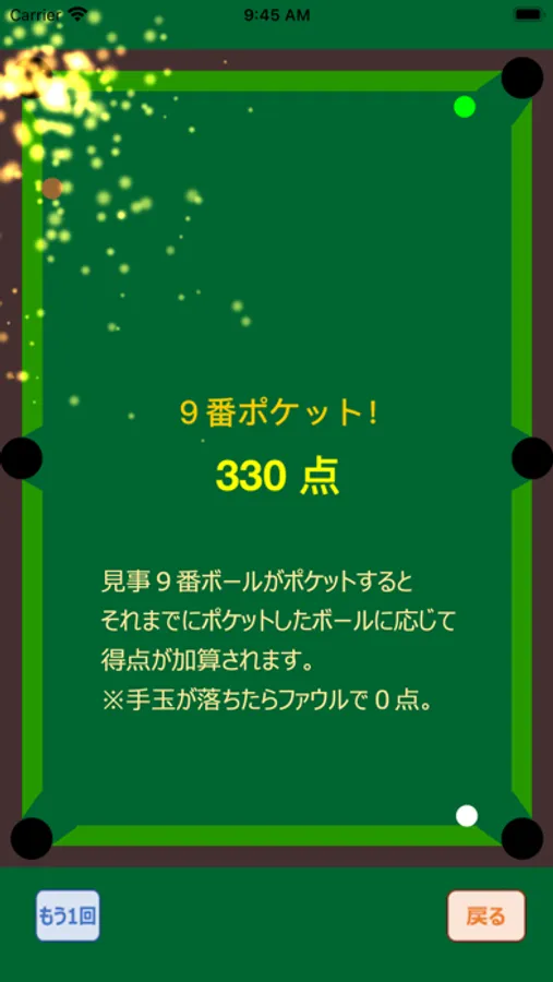 パーフェクト(手玉以外のボールがすべてポケットした場合)5回達成、ミラクル(9番ボールだけポケットした場合)5回達成で、新しいゲームが追加されます。