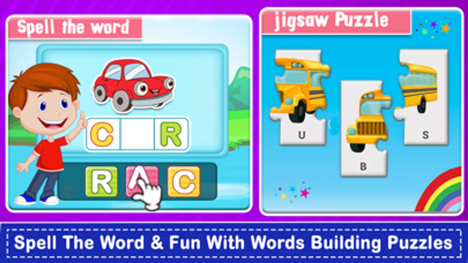On of the best educational games to teach alphabet, Hexa Puzzle, Word Spelling Puzzles, numbers, counting, cursive tracing, spell the word, article and much more,