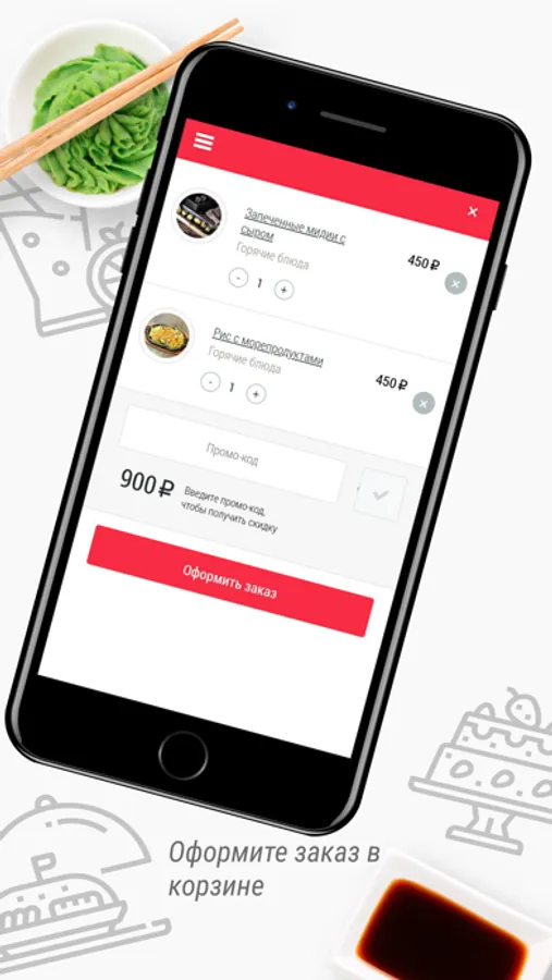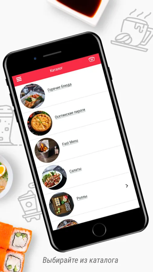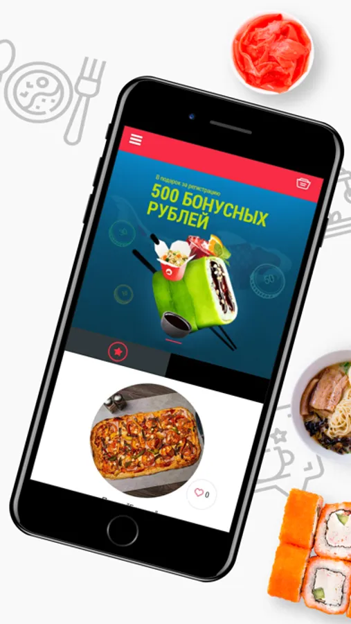 Приложение для заказа еды. Зарегистрируйтесь в личном кабинете, получайте баллы за заказы, узнавайте о новых акциях и скидках из пуш-уведомлений!