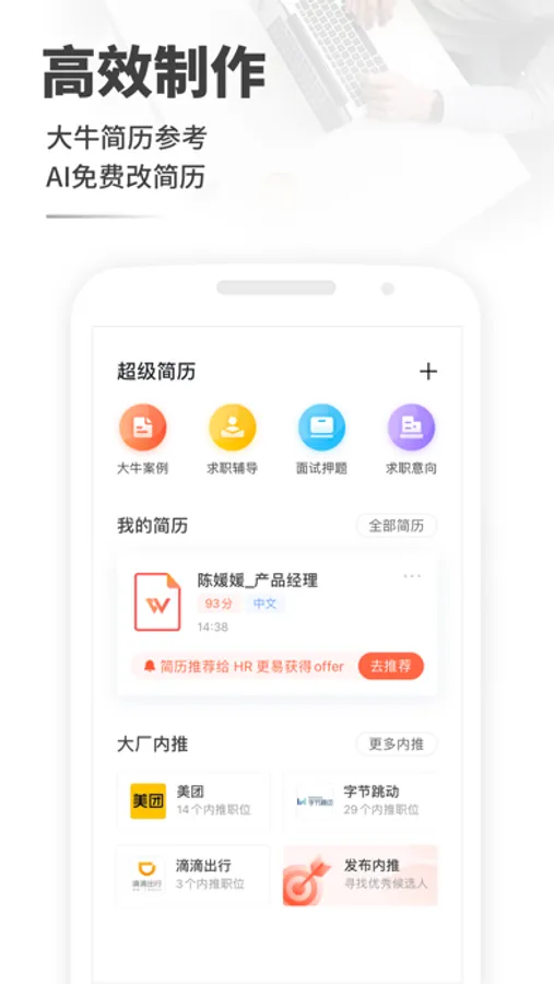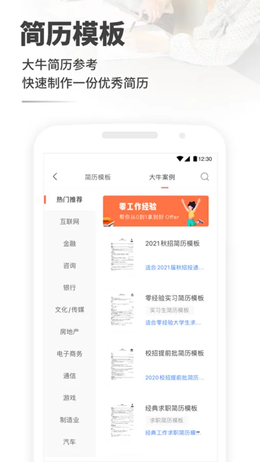 - 针对职位/行业,提供优质大牛简历模板,提供针对性更强的简历案例。