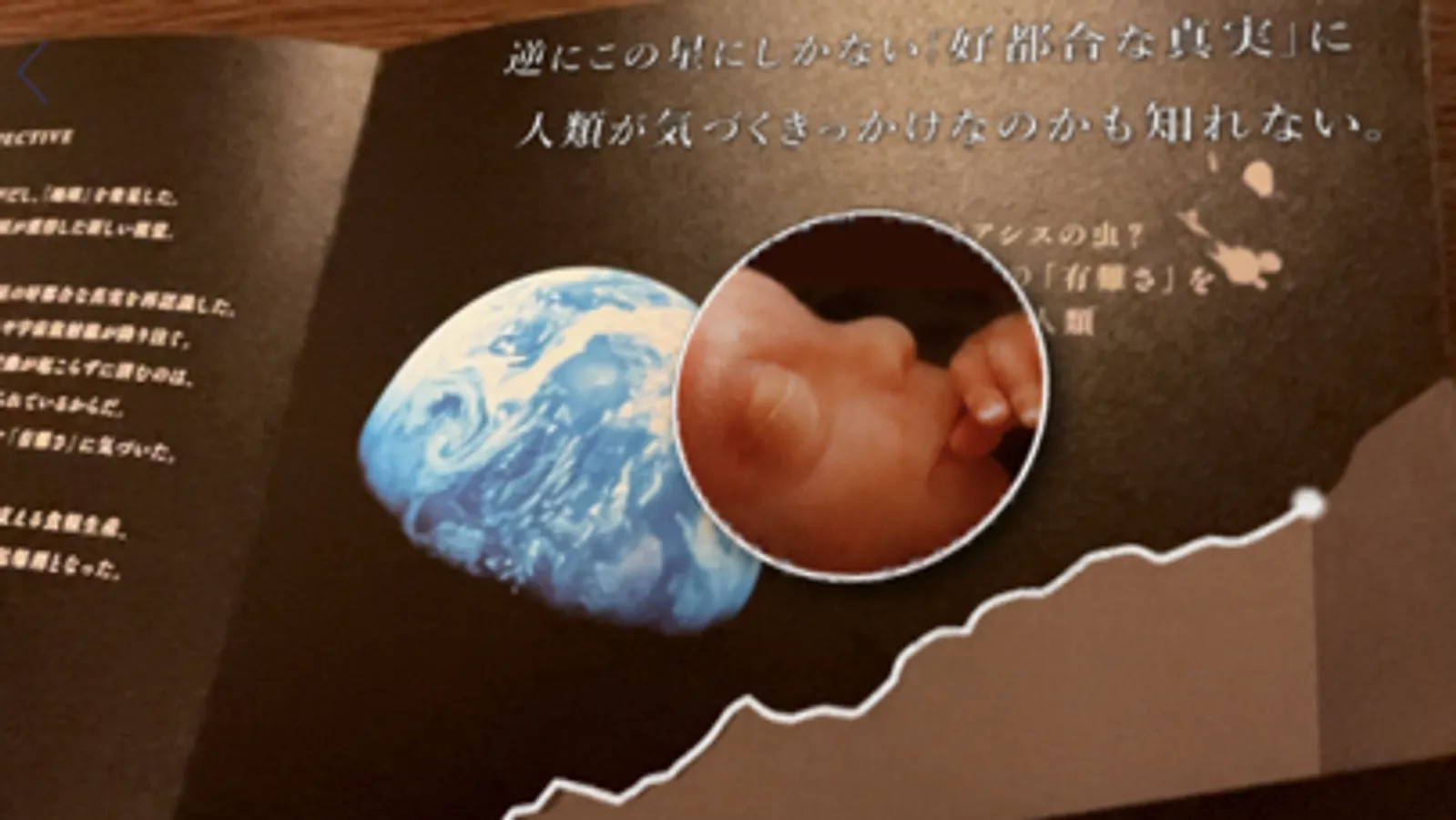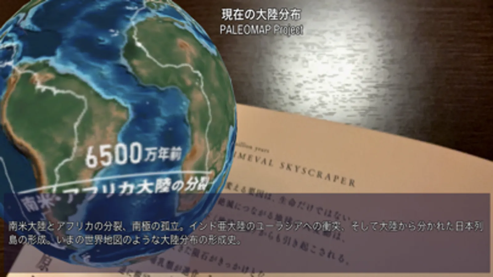 The AR function is designed to enhance users’ experience of this Earth Chronicle. On each page of the calendar, by downloading this app onto your smartphone and hovering your device over the page, you can view related phenomena such as continental drift, migration of Sapiens, and global warming simulations in the future with a live 3D globe (not unlike a pop-up picture book), or dynamically fluctuating graph pattern which traces change in temperature and climate during each period.
