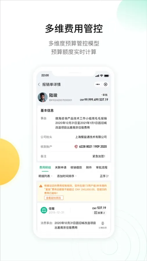 费用报销业财一体化,报销在线提交,审批节点智能流转。