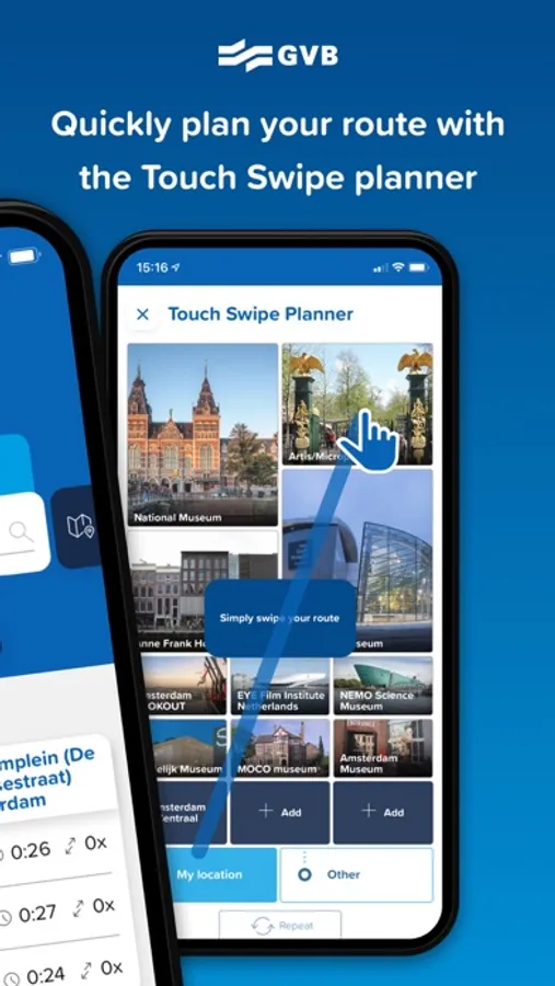 - Unique Touch Swipe planner – The most personalised trip planner in the Netherlands. Simply swipe from your current, favourite or any other set location to the key places of interest in the city and your trip will be planned instantly. Then you can personalise your destinations. Select your destinations from a list of main locations in Amsterdam and surroundings, and save them for later use.