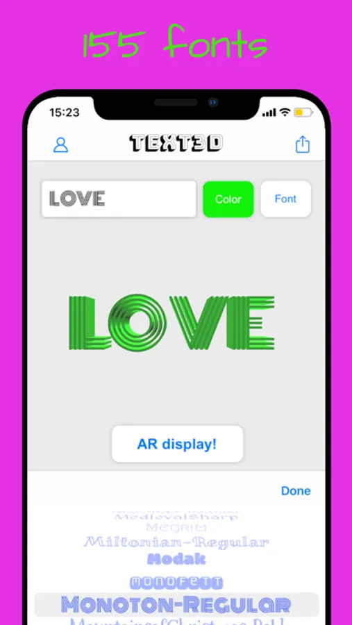 Your 3D texts are fully customizable with 155 fonts and a full color palette. Each of your AR creations is stored in the app and is then easily accessible or editable.
