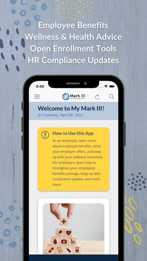 The app provides information to both employees and employers alike about employee benefit programs and wellness programs. This includes a knowledge library of different types of medical, core, and voluntary benefit packages. Employees can learn more about benefits their employer may offer, work to live a healthier lifestyle in our wellness center, view their benefit guidelines, and schedule enrollment appointments. Employers can engage with our licensed benefits specialists to improve their overall employee benefits packages and stay in compliance with the latest ACA, HIPAA, CARES Act, and other updates as required through both federal and state guidelines.