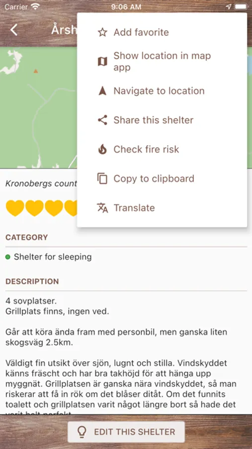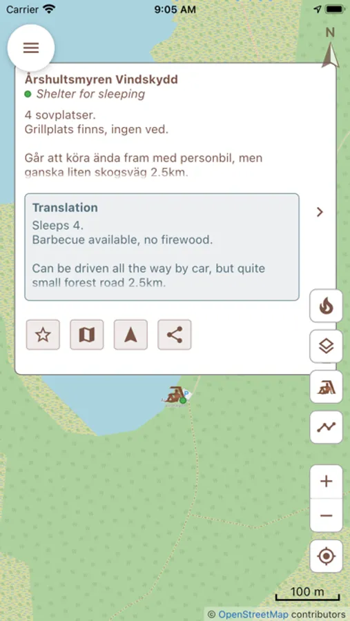 Vindskyddskartan (which means "Shelter map" in Swedish) gives you an easy to use overview of thousands of shelters on a map so you can easily find one near your location. The app is not limited to Sweden - anyone around the word is welcome to contribute to it! In some locations, the app also gives you easy access to current and forecasted fire risk and fire ban status, so you know when, where and how you can safely enjoy a campfire and cook food in nature.