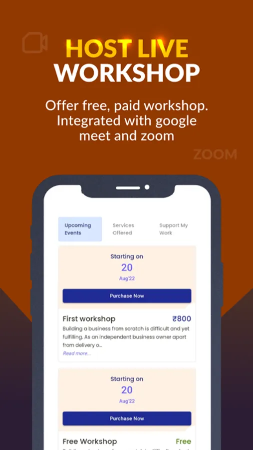 Get more audience to your workshop: Create beautifully designed workshop pages with integrated meeting links & payment option.