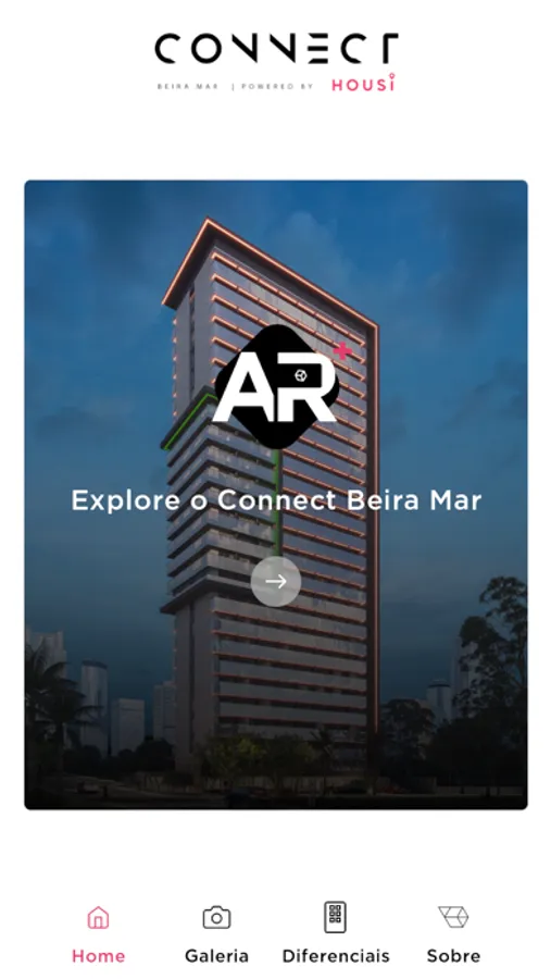 Na home deste aplicativo, você verá as informações do empreendimento (galeria de imagens, informações e dados para contato), além, claro, do botão de acesso à Realidade Aumentada. Quando selecionar a fachada, a câmera será iniciada com instruções para o ancoramento do modelo no ambiente.
