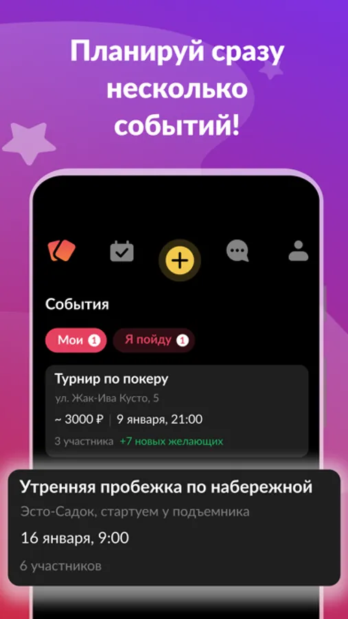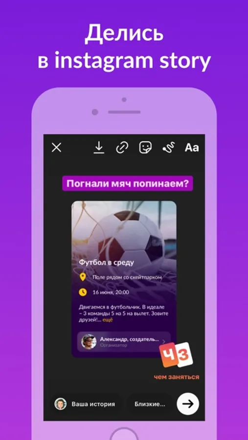 Здесь ты всегда найдешь компанию для любого события: поход в кино, прогулка в парке или занятие йогой. Можешь даже собрать футбольный матч у себя во дворе или поехать за город на пикник. Скачай приложение и забудь про скуку раз и навсегда!