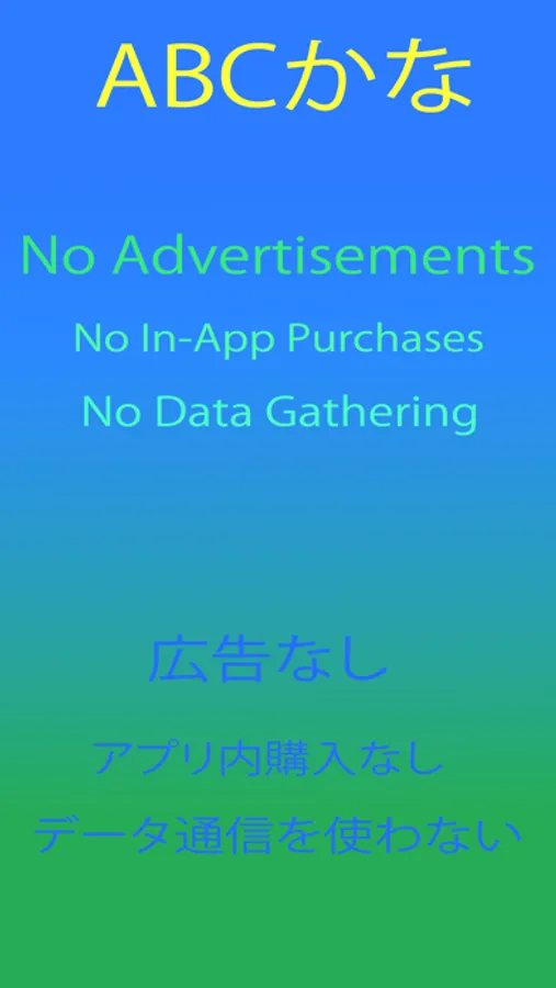 ABCかな has no advertisements, no In-App purchases, and no data gathering. Created by parents that just wanted a great app for kids to learn English and Japanese.